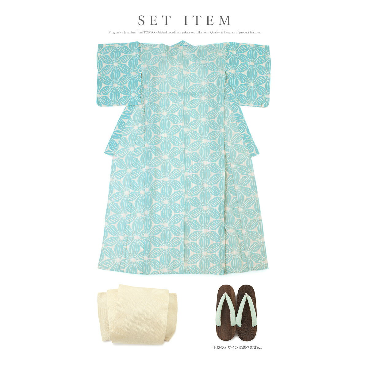 【9/1限定★クーポンで10%OFF】浴衣 セット レディース レトロ 浴衣セット 3点セット 水色 ブルー 白 麻の葉 綿麻 半幅帯 女性 ボヌールセゾン マクレ 30代 40代 ママ 大人浴衣 【送料無料】【あす楽対応】